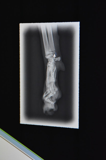 För cirka 1 månad sedan så tyckte jag att Piper haltade lite när hon gick. Då klippte jag även klorna på henne, dom som gick att klippa, "flärparna" vågade jag inte ge mig in på. Var rädd att där kanske var en pulpa som jag inte kunde se. Redan då sa Marcus att det klickade när hon gick och hade gjort det då ett tag, vi trodde väl alla att det kunde bero på klorna som då satt snett. Det lät inte så mycket så det var svårt att veta. Men sista månaden hade hon alltså börjat halta mer och man hörde klickandet högre. I tisdags hörde jag tydligt att det kom från hennes skelett och ringde då till veterinären för att få en tid för undersökning, röntgen samt kloklippning. Röntgen för att få koll på om flärparna hade någon pulpa, och även för att se hur hennes klo egentligen var sammansatt. Jag hade sett bilder på hur det kunde vara och på dom bilderna var skelettet för tassen mer eller mindre en enda röra, det var som att dom slingrade ihop sig, och krokiga.